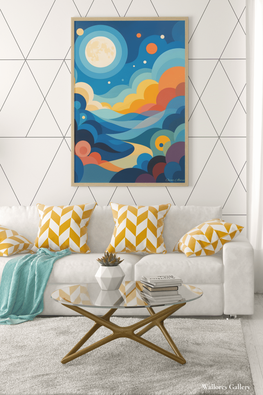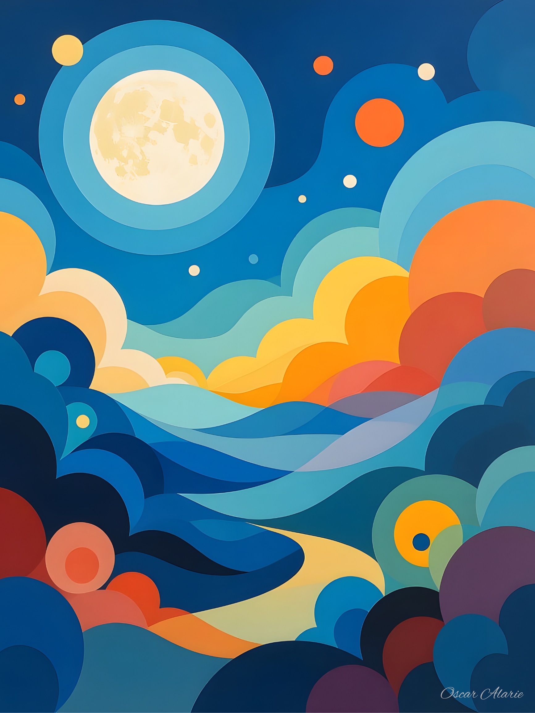 There’s a kind of quiet magic in this scene, the kind that feels like it only appears when the world isn’t looking. You can almost imagine stepping into it, standing just beyond those rolling waves of color, and feeling the night wrap around you like something familiar. The moon sits high and bright, not harsh or demanding, but steady, almost like a lantern hung above a path that only shows itself after dark. Everything here moves with a calm rhythm, the kind you notice when you finally slow down long enough to breathe.