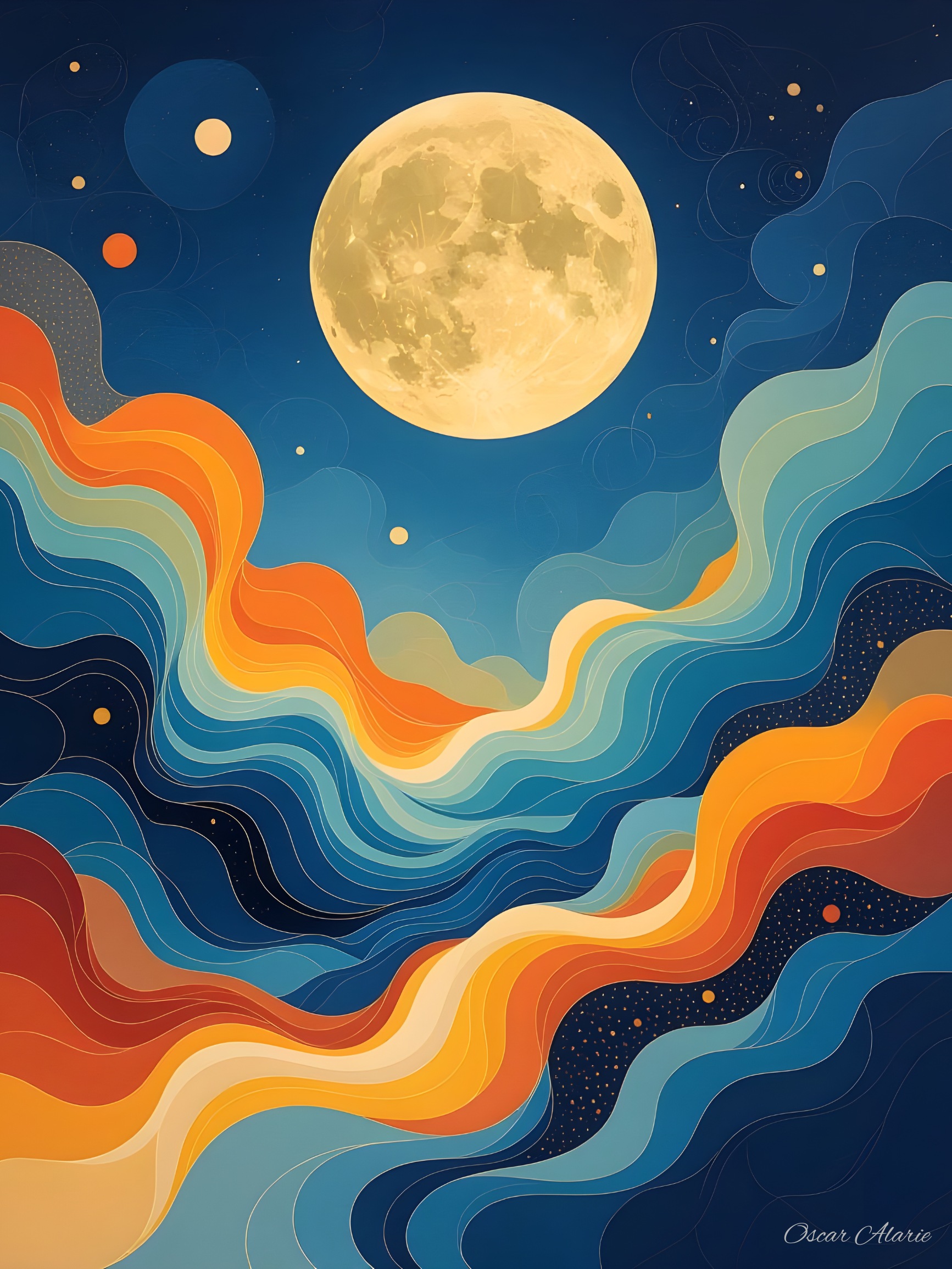 There’s something luminous about this landscape, as if the night has decided to show off a little. Layers of deep blues, gentle greens, and warm golds rise and fall across the horizon in smooth, flowing waves. The moon sits high above it all, glowing with a steady softness that pulls the colors forward without ever overwhelming them. It feels like one of those rare places where the night doesn’t hide anything, it simply shifts the world into a gentler version of itself.