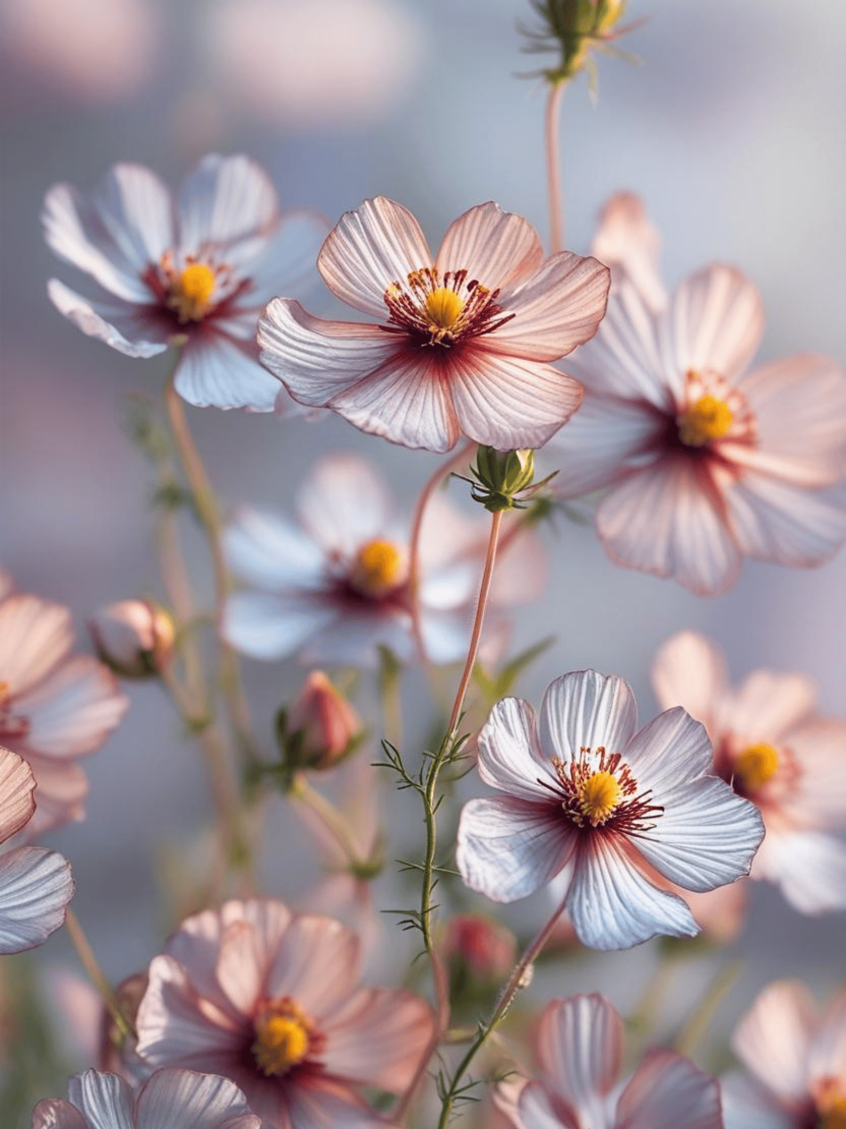 Set against a soft, blurred background, the cosmos appears suspended in a tranquil space, drawing the viewer’s attention to their exquisite details. Soft, diffused lighting enhances this effect, casting gentle shadows that highlight the intricate forms of each bloom.