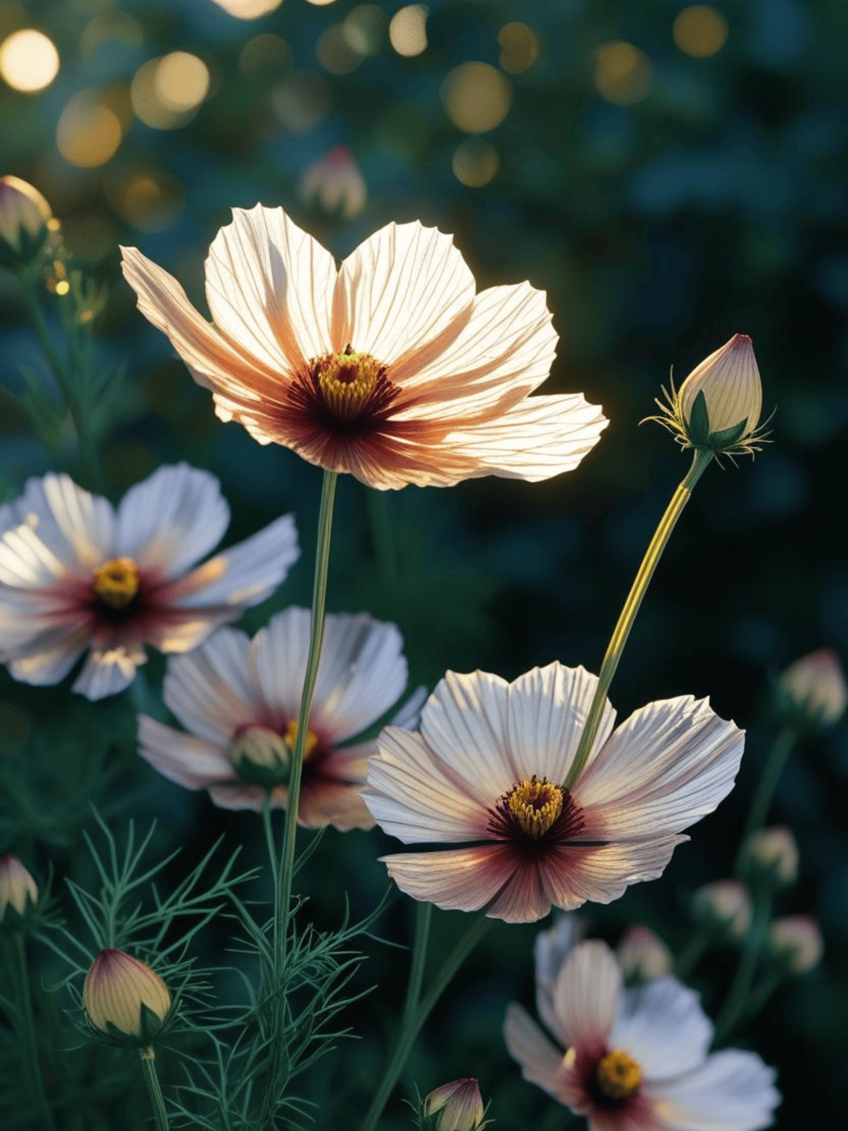 Soft, diffused light plays across their surfaces, highlighting the subtle gradations of color and creating a sense of depth and dimensionality. This is not merely a depiction of cosmos blooms; it is an exploration of texture, light, and the inherent beauty found in the most unassuming corners of the natural world.