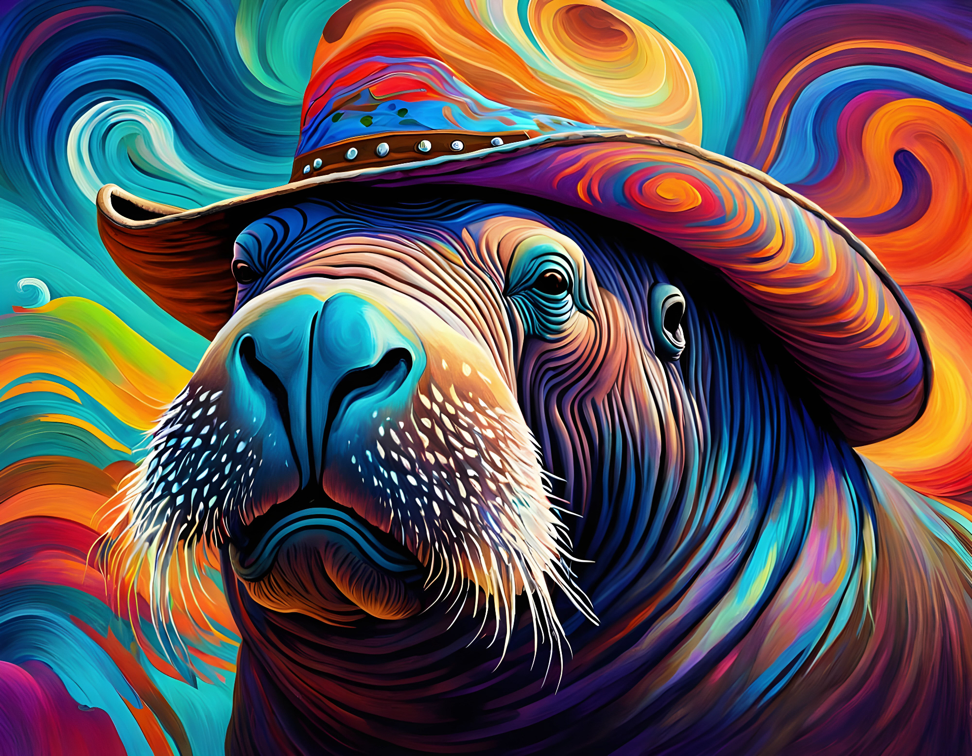 The psychedelic painterly background, a vibrant fusion of nebula explosions and cosmic hippie vibes, mirrors James’s own adventurous spirit and his deep connection to the natural world. With visible brushstrokes that capture the raw energy and unbridled passion of the artist, this piece invites you to delve into the life of a true pioneer. As a core member of the Walrusino Crew, James played a vital role in establishing new settlements and ensuring the survival of countless walrus families.