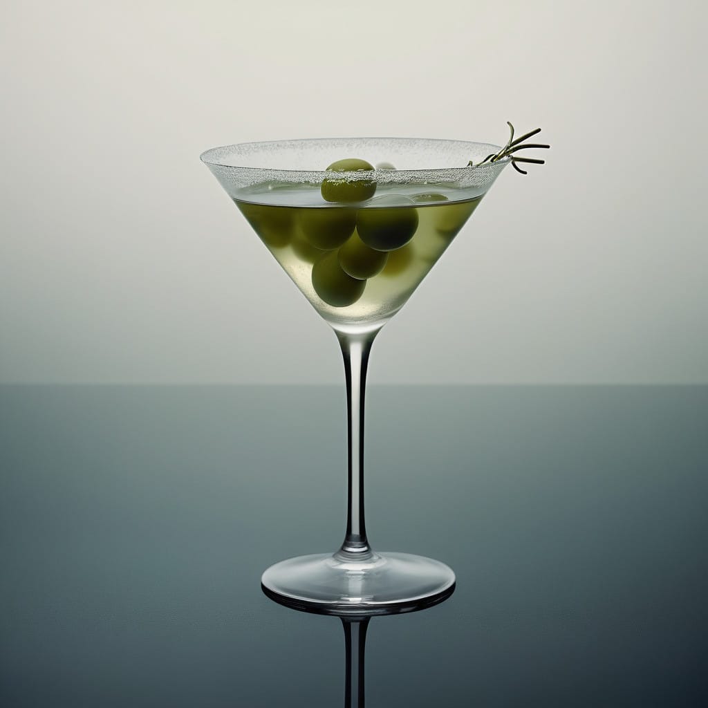 The martini sits in stark contrast against a blurred black and white background, a dreamlike canvas with no hard edges or defined boundaries. This lack of definition draws the eye directly to the focal point – the martini and its olive bounty – creating a sense of both isolation and intense focus. The absence of sharp lines further emphasizes the fluid, intoxicating nature of the drink.