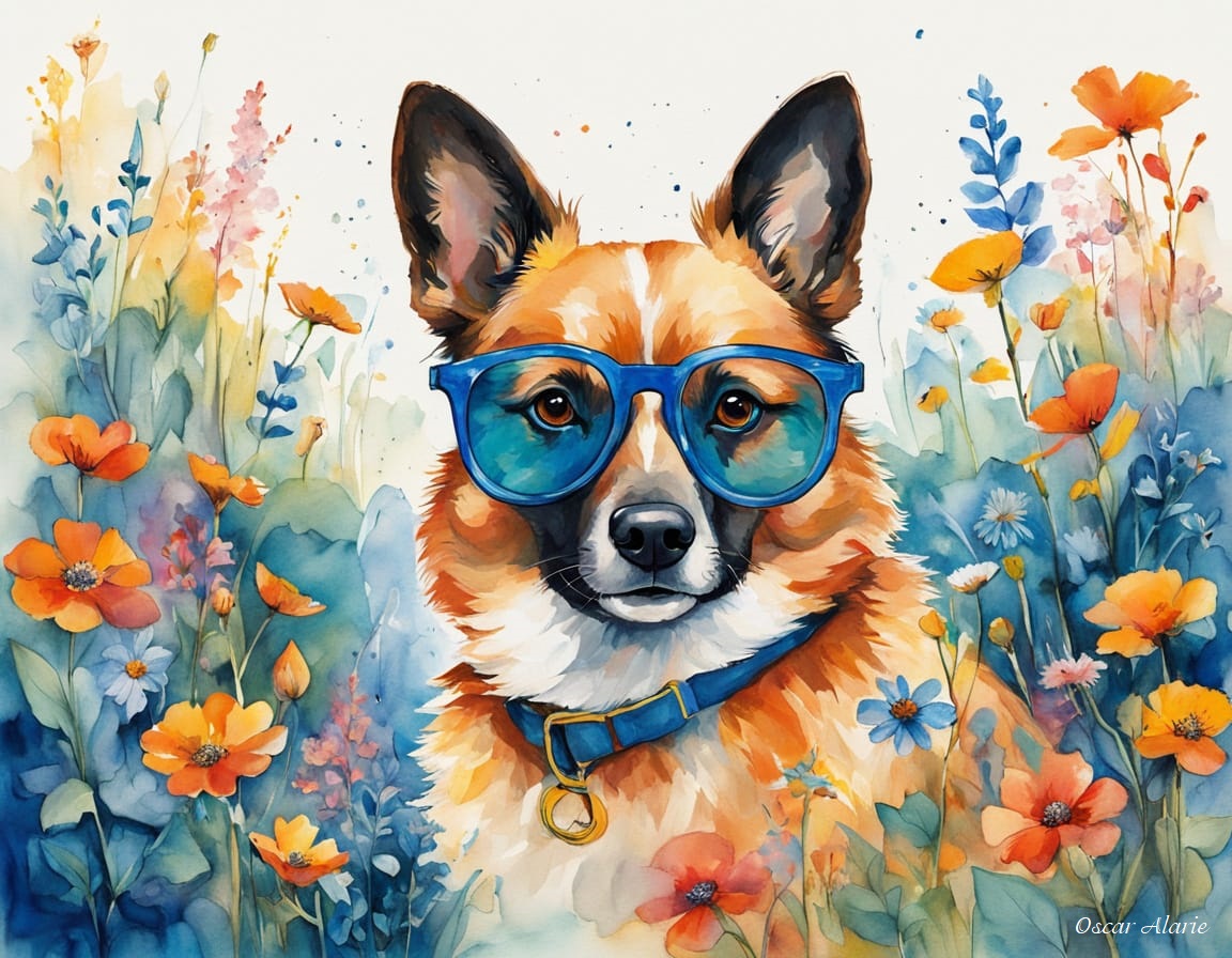 Available in landscape format (24×18), this artwork captivates with its bold, abstract complementary colors and delicate, fine details that invite closer inspection. The canine, sporting bright blue, rounded glasses, exudes an air of gentle wisdom and playful charm.