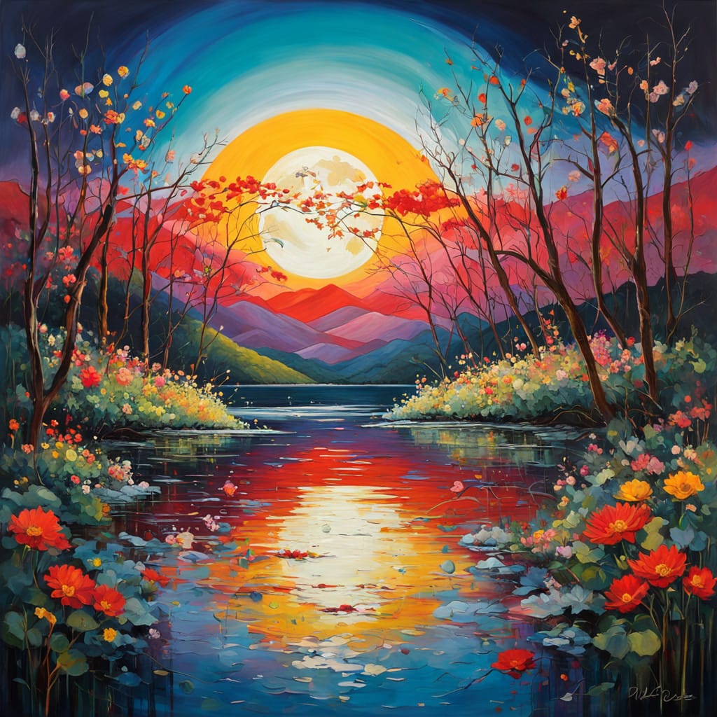 Imagine a small, still pond, its surface as smooth as glass, reflecting the breathtaking spectacle of the sunrise above. The scene is rendered in rich, vibrant colors, evoking the texture and depth of a classic oil painting. Each brushstroke seems to capture the fleeting moments of dawn, preserving the beauty for eternity.