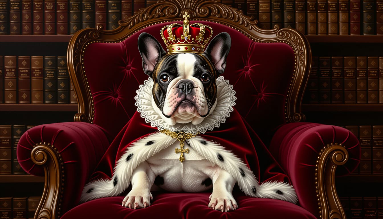 The subject, however, was impossible to ignore once found. The little dog sat upright on a grand settee; the light spilled across his coat in pale amber tones. His head tilted slightly, ears sharp, eyes full of alert curiosity. He wore a velvety cloak, a crown and a small silk ribbon tied neatly at the neck.