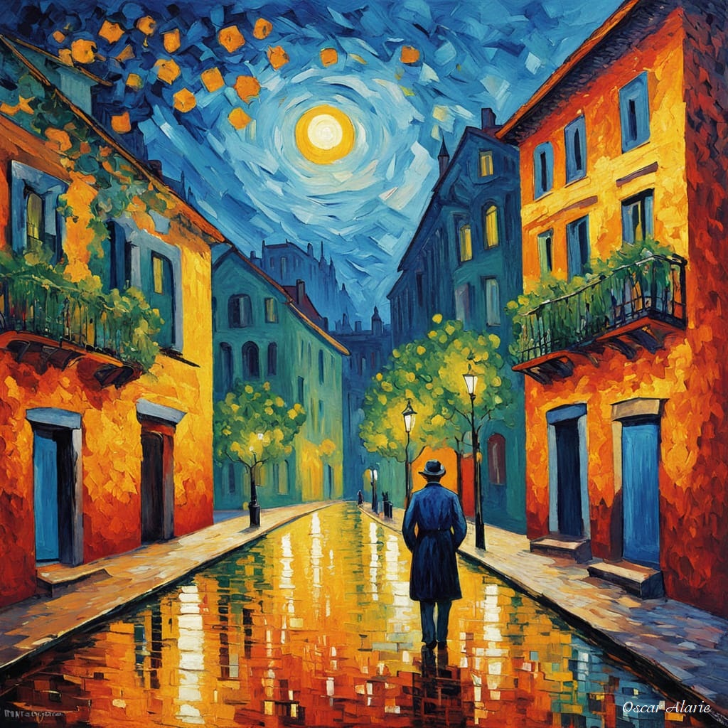 This piece, available in square formats (8×8, 16×16, and 24×24), draws inspiration from the bold Fauvist style of Henri Matisse, the expressive brushwork of Vincent van Gogh, and the neo-impressionist techniques of André Derain. The result is a scene that explodes with energy and movement, a kaleidoscope of color and distorted perspectives.